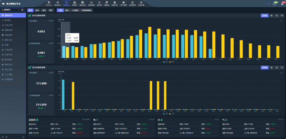 能源侧:解决能源消耗 “看不清、管不住、算不准” 的问题,实现对水、电、气、热等多种能源的实时监测、分项计量、能效分析与优化调度。
