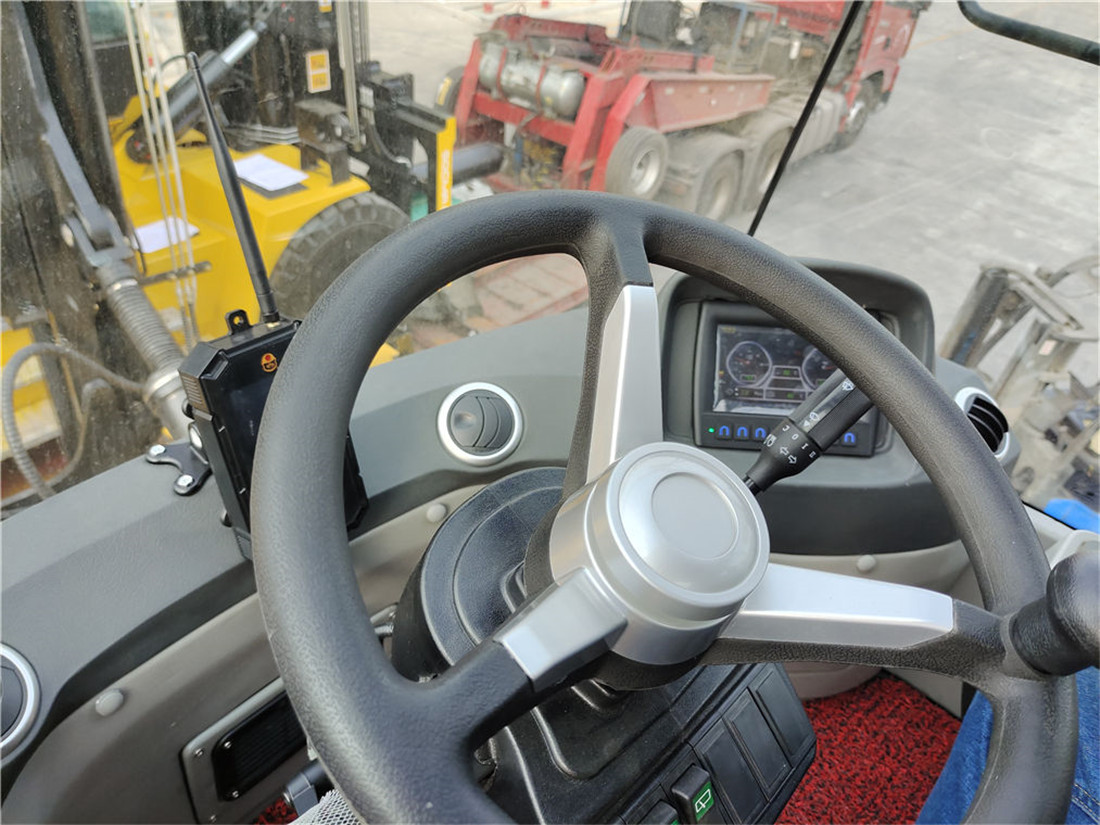 采用横置油缸式转向桥,全液压转向,转向桥结构紧凑,转向角可达70.5°,有利于减小转向阻力,减轻轮胎磨损,提高行驶时的平顺性。