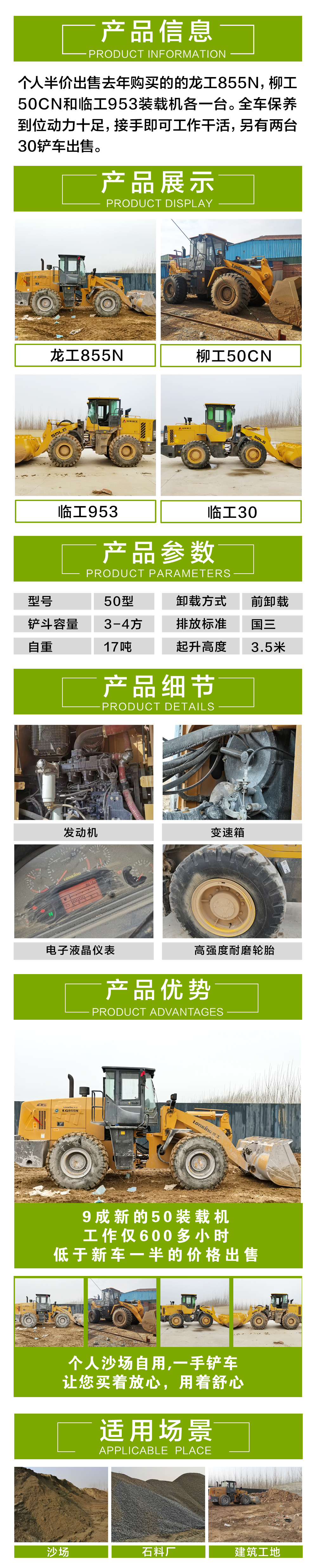 ?半价出售自己料场用3台50装载机和两台30装载机,全车保养到位动力十足,整体车况9成多新,工作时长700小时左右,全车原版原漆无剐蹭,有需要的可随时联系我。