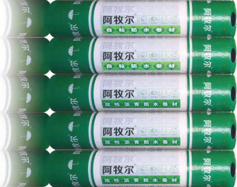 上表面覆以聚乙烯膜、细砂、页岩、铝箔或隔离膜为隔离层,下表面覆涂硅隔离膜为防粘层而制成的自粘聚合物改性沥青聚酯胎防水卷材