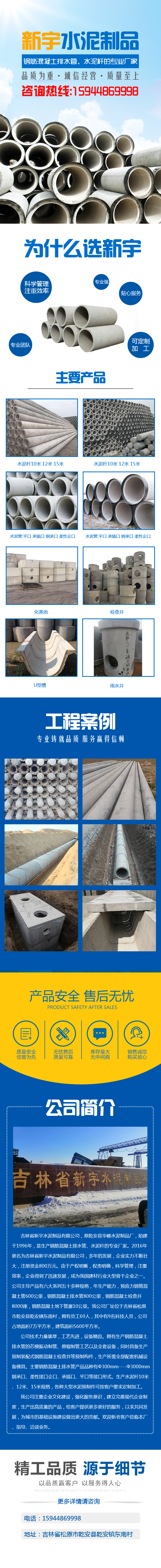 吉林省新宇水泥制品有限公司,原乾安县华峰水泥制品厂,始建于1996年,是生产钢筋混凝土排水管、水泥杆的专业厂家。2016年更名为吉林省新宇水泥制品有限公司,多年的发展,企业实力不断壮大,注册资金800万元。由于产权明晰,权责明确,科学管理,注重效率,企业得到了迅速发展,成为我国建材行业大型骨干企业之一。公司主导产品有六大系列五十多种规格,年生产能力,预应力钢筒混凝土管600公里,钢筋混凝土排水管800公里,钢筋混凝土检查井8000座,钢筋混凝土地下管廊10公里。我公司厂址位于吉林省松原市乾安县乾安镇东南村,拥有员工69人,其中有9名科技人员,公司占地面积7万平方米,建筑面积5600平方米。