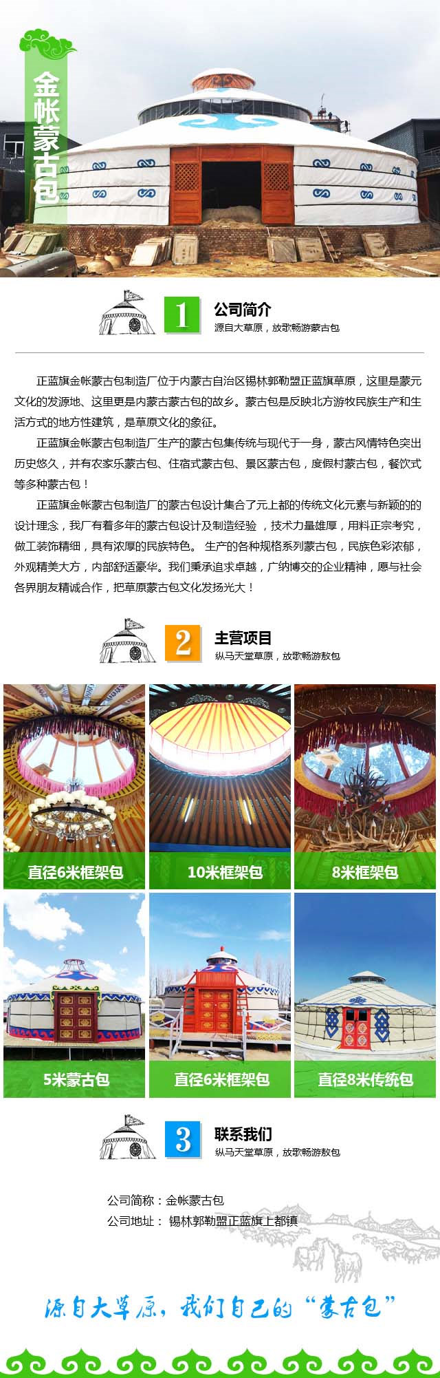 正蓝旗金帐蒙古包制造厂位于内蒙古自治区锡林郭勒盟正蓝旗。美丽富饶的正蓝旗是蒙元文化的发祥地,察哈尔民俗典型代表地区,中国蒙古语标准音示范基地。世界文化遗产一一元上都遗址坐落于境内。这里也是蒙古包的故乡。蒙古包是北方少数民族的历史产物,是草原牧人智慧的结晶,是草原博大文化的象征。