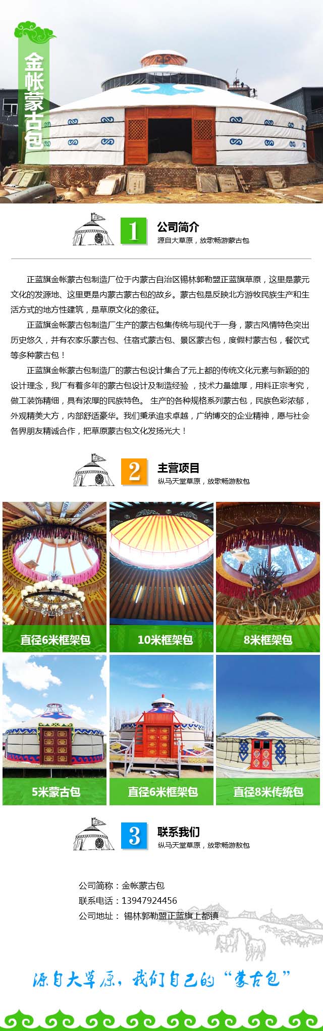 正蓝旗金帐蒙古包制造厂位于内蒙古自治区锡林郭勒盟正蓝旗。美丽富饶的正蓝旗是蒙元文化的发祥地,察哈尔民俗典型代表地区,中国蒙古语标准音示范基地。世界文化遗产一一元上都遗址坐落于境内。这里也是蒙古包的故乡。蒙古包是北方少数民族的历史产物,是草原牧人智慧的结晶,是草原博大文化的象征。