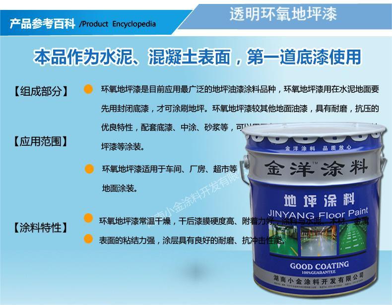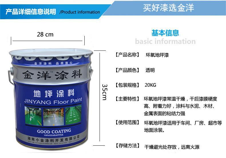 金洋环氧地坪面漆 环氧地坪透明漆 是采用聚酰胺树脂作固化剂 环氧树脂有一定的润湿力 能排挤物体表面水而涂布 有优良的附着力 耐酸碱性好 适应于地下室 厂房 车间蓝球场等