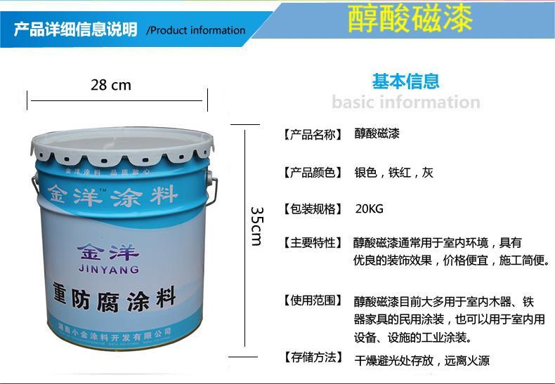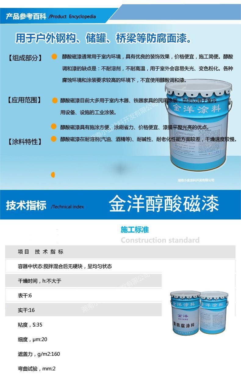 金洋白色醇酸磁漆 调和漆 适用范围室内木器铁器家具民用涂装 工业涂装 其优点是价格便宜 涂刷省力 缺点是防腐效果 耐酸碱 耐老化性较差 但施工简便等 欢迎选购