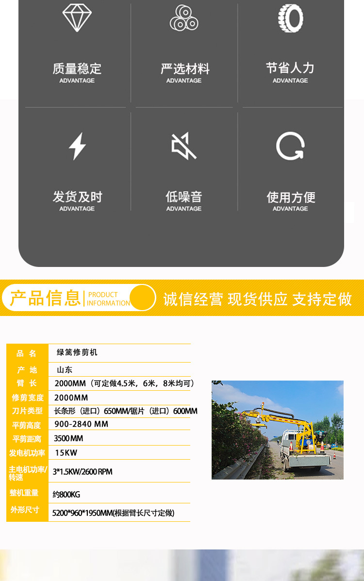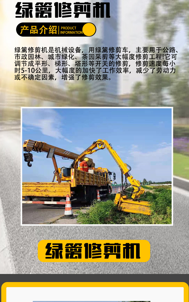 该绿篱修剪机主要用于高速公路、市政园林、城市绿化、茶园采剪等大幅度修剪工程。修剪速度每小时5-20公里,大幅度的提高了工作效率,减少了劳动力或不安全因素,增强了修剪效果。