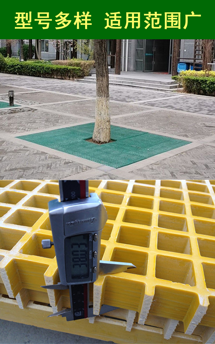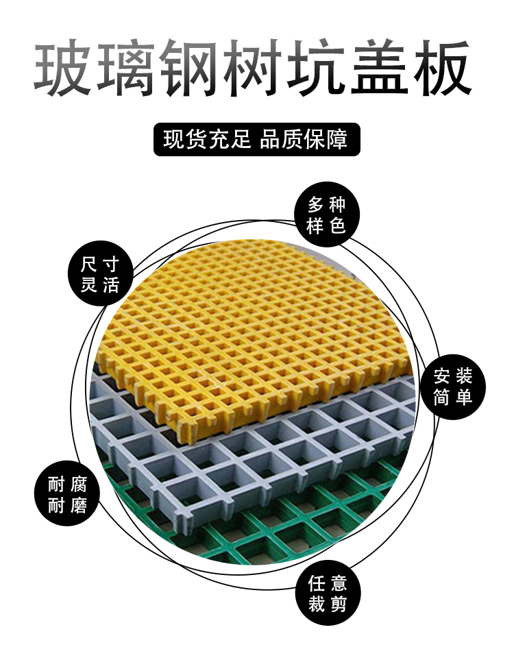 树篦子采用树脂与玻璃纤维制作而成,安装施工简单、重量轻、承载好、抗冲击好、排水量大,经过模塑处理后美观整洁,防腐防锈,有铸铁树篦子不可比拟的优点,并有防盗功能。在规格和尺寸上,我们是按照客户的要求定做的。它的颜色有黄色、灰色、黑色、绿色等,客户可以任意选择。产品是由色浆和树脂相融合在一起,所以不易掉色,也不会因雨雪天气的洗礼而褪色,有不褪色的性能。