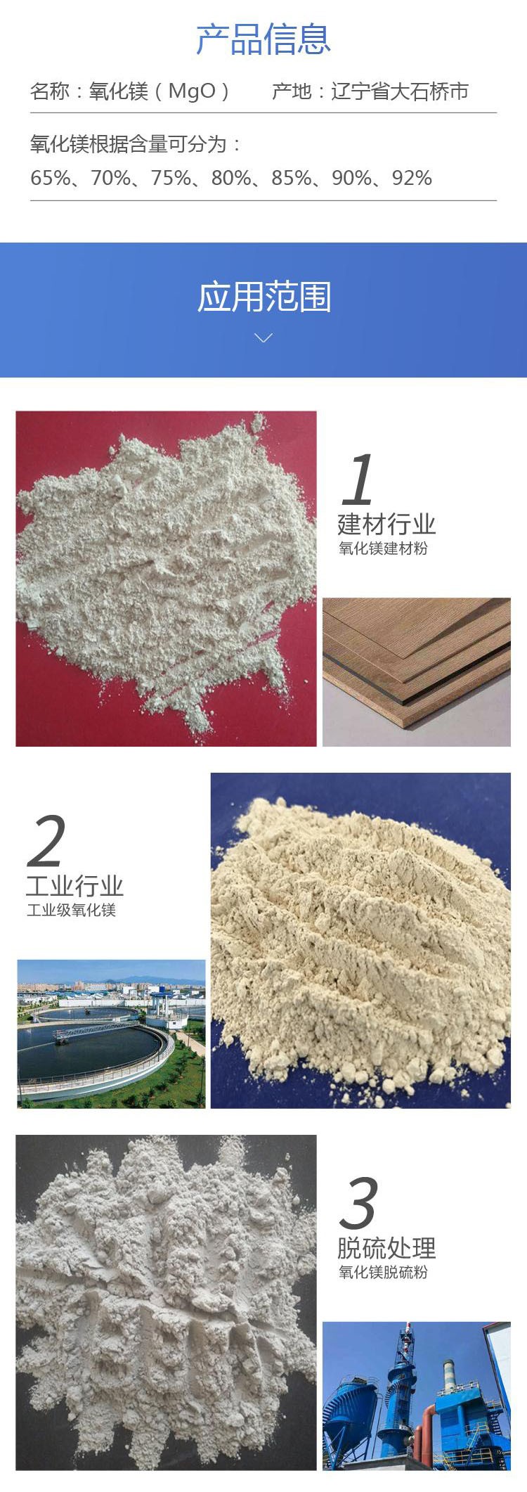 我厂致力于氧化镁产业已有数年,具有先进的采矿、烧结、粉粹、运输一条龙生产线(年产量在5万吨以上)以及经验丰富的技术人员:是氧化镁生产厂家,我厂产品选用优质菱镁矿石,在反射窑900摄氏度高温焙烧后,加工粉粹而成,其物理特征:纯度高、活性好、低钙、低铁、低硫、固体粉状。顾客至上,专业打造服务质量,行动高于承诺是我厂不变的宗旨",我厂将以的服务、的产品、的价格诚邀用户莅临洽谈!
