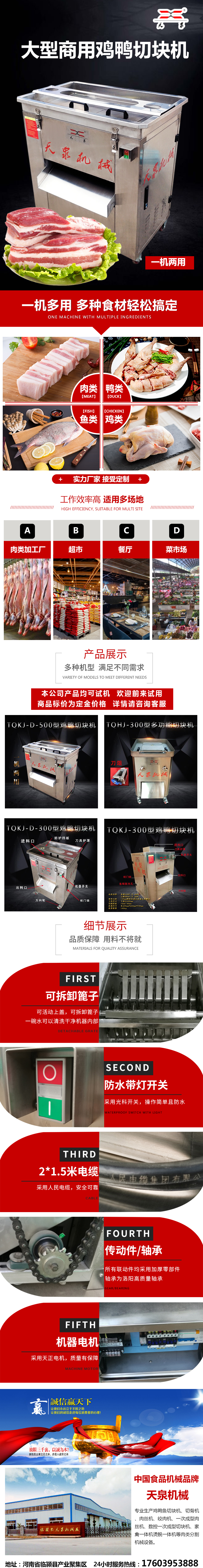河南省天泉食品机械设备有限公司主营:肉丝机 鸡鸭鱼切块机 切骨机 一次成型肉丝机 家禽烫脱机 大型肉片机 绞肉机 大型一机多用切骨机 食品机械配件等肉类分割机械设备。