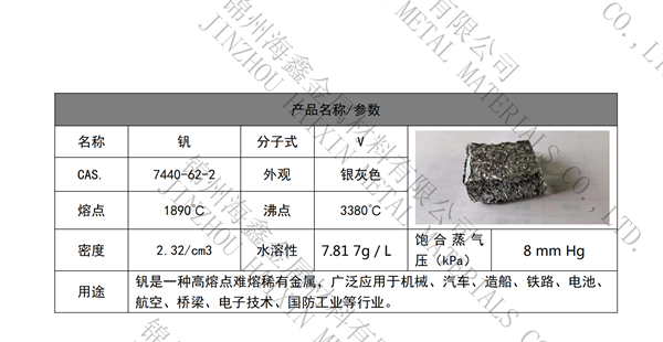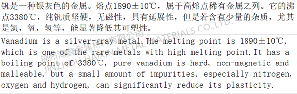 钒:元素符号 V,银灰色金属,在元素周期表中属VB族,原子序数23,原子量50.9414,体心立方晶体,常见化合价为+5、+4、+3、+2。钒的熔点很高,常与铌、钽、钨、钼并称为难熔金属。有延展性,质坚硬,无磁性。具有耐盐酸和硫酸的本领,并且在耐气、耐盐、耐水腐蚀的性能要比大多数不锈钢好。室温下致密状态的金属钒较稳定,不与空气、水和碱作用,也能耐稀酸钒是一种银灰色的金属。熔点1890±10℃,属于高熔点稀有金属之列。它的沸点3380℃,纯钒质坚硬,无磁性,具有延展性,但是若含有少量的杂质,尤其是氮,氧,氢等,能显著降低其可塑性。