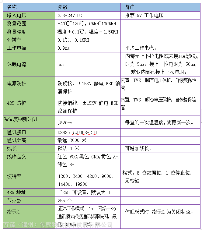 WN-201系列是我司新推出的一款低功耗的高精度温湿度传感器,具有防水、耐高温高湿、宽电压 3.3V~24V 输入等特点。采用 485 通讯,标准 Modbus-RTU 通讯协议,内置进口高精度 sht30 传感器芯片,温度±0.3℃,湿度±3%RH。传感器具有超小的体积,保护套采用铜烧结保护壳和 PE 防水保护壳,铜烧结保护壳通过铜颗粒烧结后镀镍,具有透气、耐高温、抗腐蚀等特点,提升传感器寿命,接线部分采用航空插头,可快速安装和拆卸;PE 防水保护壳采用高分子 PE 材料烧结滤芯,能够防水,滤除灰尘,对高速流动的气体起到缓冲的作用,测量温湿度的结果更平稳准确,适用于室外淋雨、高湿度农业大棚等环境。
