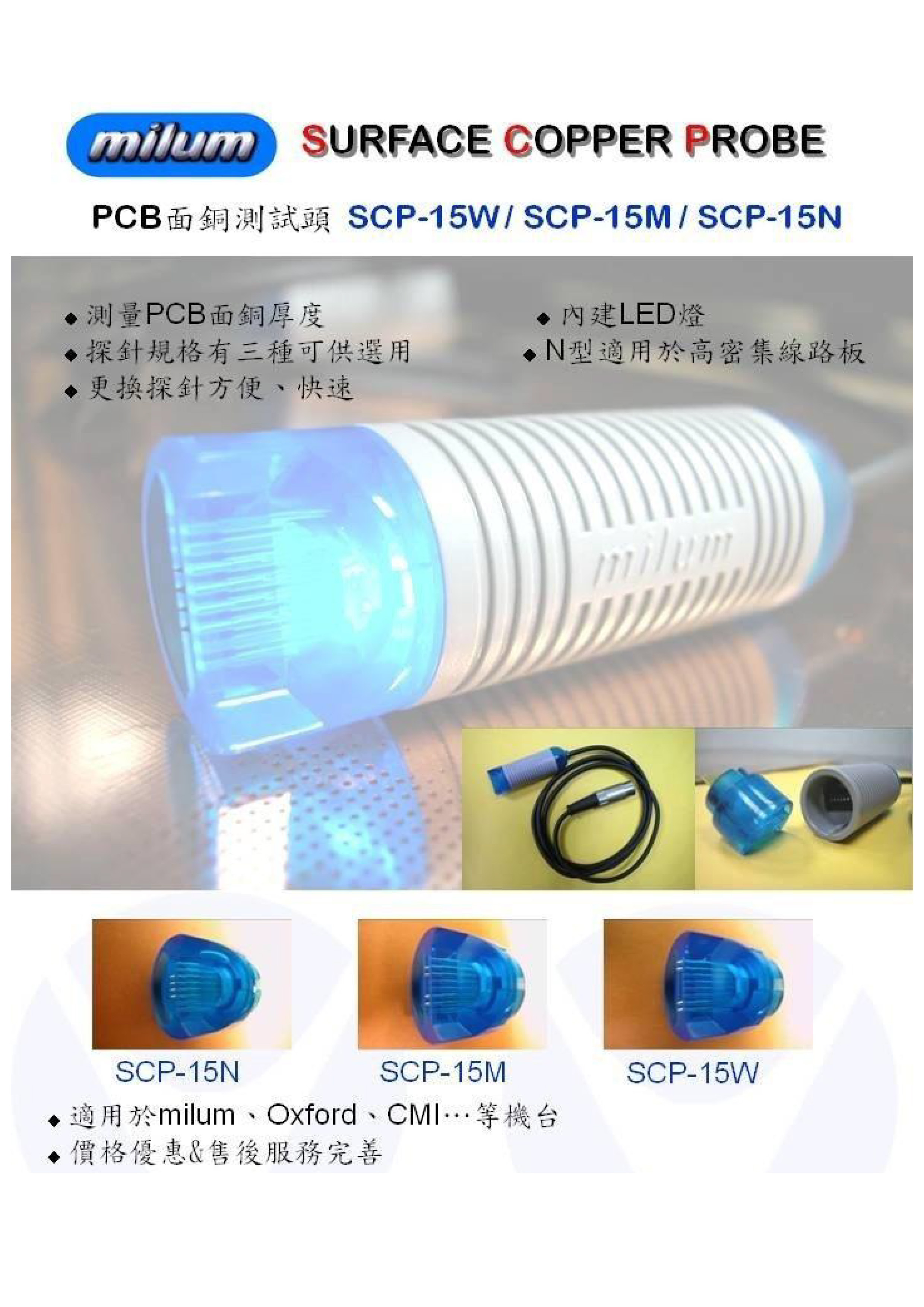 SCP-15为面铜厚度测量专用测试头,其能选用不同的探针距离规格并快速精确地测量PCB面铜之厚度。
