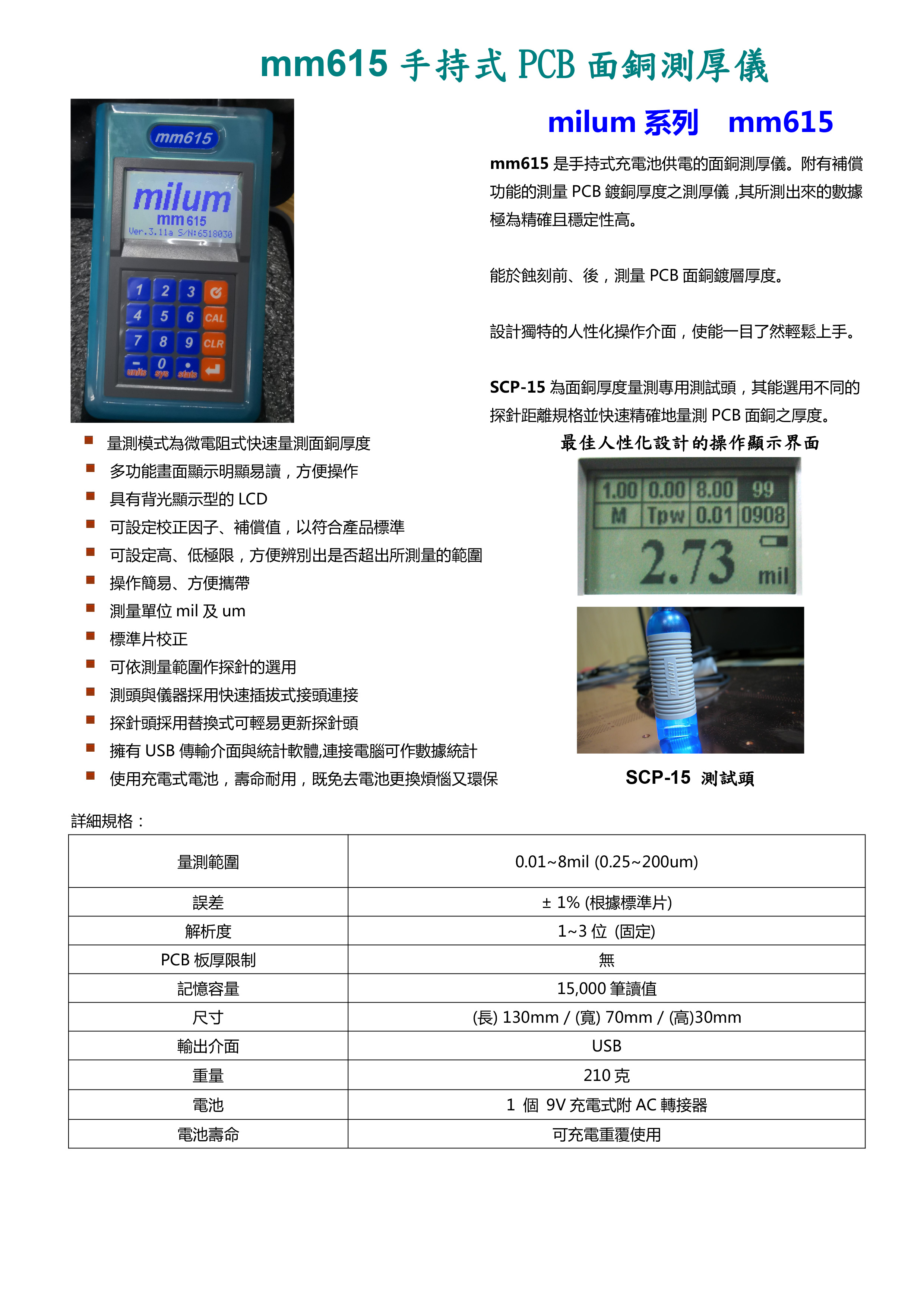 milum mm615是手持式充电池供电的面铜测厚仪。附有补偿功能的测量PCB镀铜厚度之测厚仪,其所测出来的数据极为精确且稳定性高。