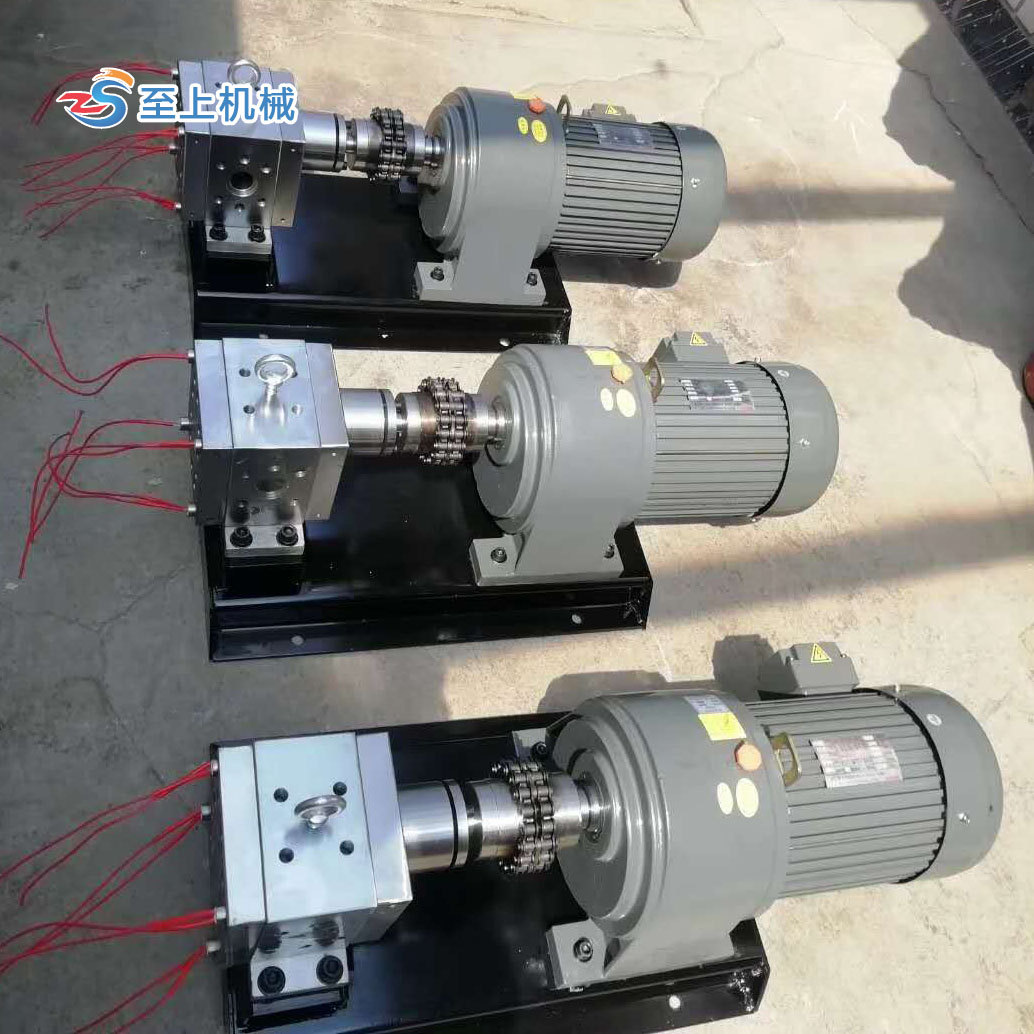 属于正位移泵,工作时依靠主、从动齿轮的相互啮合造成工作容积变化来输送熔体。工作容积由泵体、齿轮的齿槽及具有侧板功能的轴承套构成。当齿轮旋转时,熔体即进入吸入腔两齿轮的齿槽中,随着转动,熔体从两侧被带入排出腔,齿轮再度啮合,使齿槽中的熔体被挤出排出腔,压送到出口管道。轴承不能使用通常的润滑油脂,以避免污染熔体,通常采用熔体自润滑。