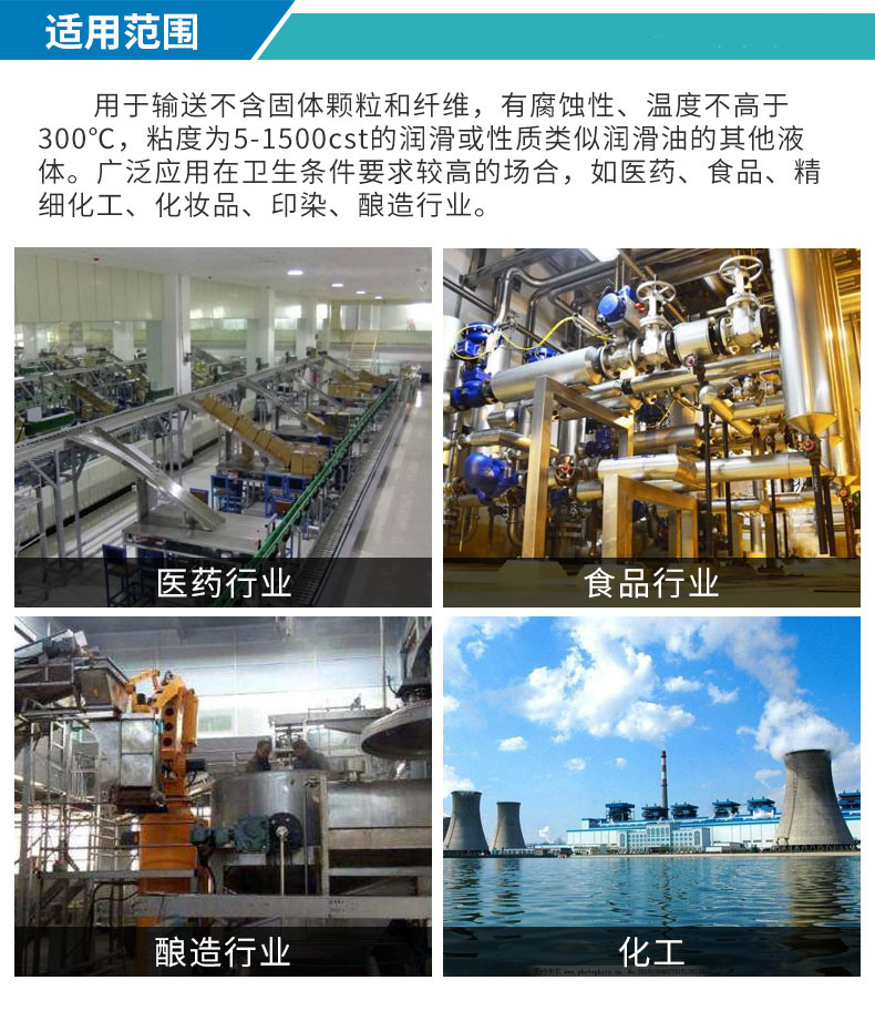 KCB不锈钢齿轮泵主要用于各种机械设备中的润滑系统中输送润滑油,适用于输送粘度为5×10-6~1.5×10-3m2/s (5-1500cSt),温度在300℃以下的具有润滑性的油料。不锈钢齿轮泵,可输送无润滑性的油料、饮料、低腐蚀性的液体。配用铜齿轮可输送低内点液体,如汽油、苯等。本系列不锈钢泵除配置普通电机外,还可根据用户需要配置同规格的防爆电机。材质:304.316.316L不锈钢。