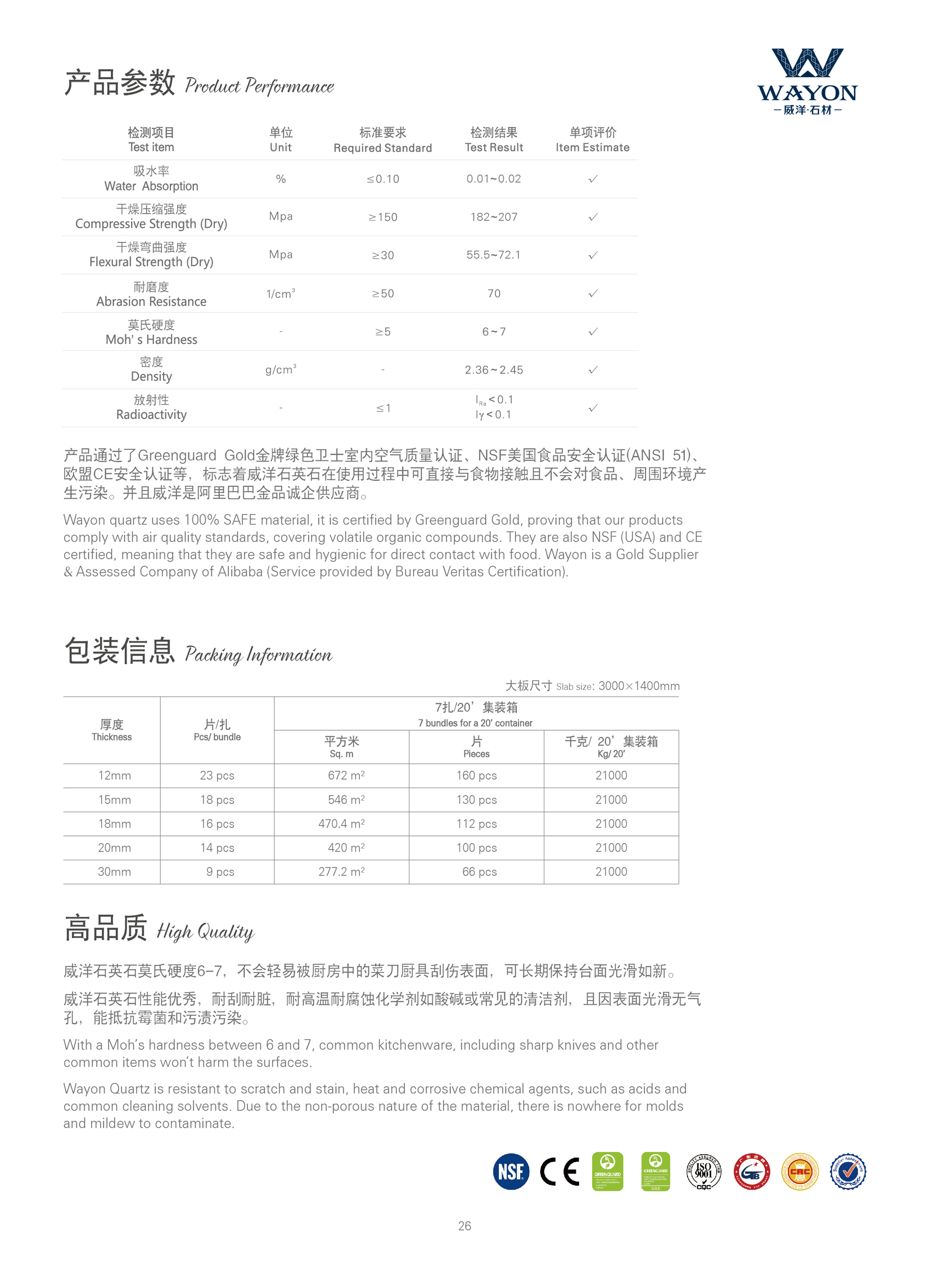 年产量超过150万平方米高品质人造石英石水磨石板材、台面板、墙地砖。