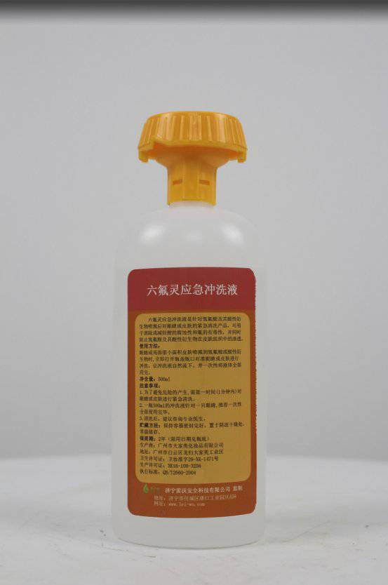 2021500ml六氟灵应急冲洗液 HF冲洗液技术参数:针对氢氟酸及其酸性衍生物喷溅后对眼睛或皮肤的紧急清洗产品,可用于消除或减轻酸的腐蚀性和氟的有毒性,并同时阻止氢氟酸及其酸性衍生物在皮肤组织中的渗透。有效期两年。容量:500ml