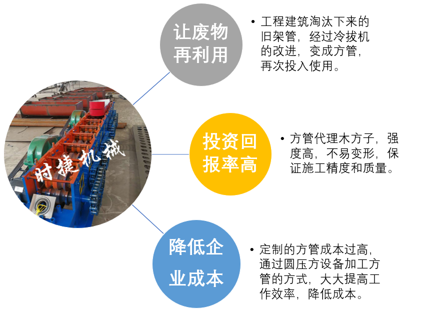 工程建筑淘汰下来的旧架管,经过冷拔机的改进,变成可以代替木方的方管。使用更稳固。成本也会降低。圆管压方管成型设备公司新研发的一种新型机型,它是把费用的建筑用圆管钢材回收以后,再用机器加工成方管,加工方管同时除锈刷漆一次完成,废物利用,变废为宝,圆管压方管成型机方管在继续用到建筑机械方面。