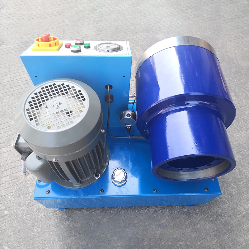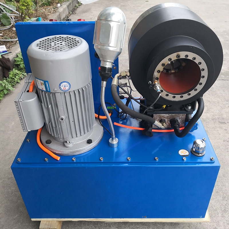 油泵安装于油箱内浸泡在液压油里达到科学散热静音的设计目的,油泵在电机驱动下,输出液压油,推动扣压油缸内的柱塞运动,致使模座径向收缩,实现模具对胶管接头外套的挤压。当收缩量达到千分尺设定值时,挤压自动停止,电磁换向阀换向后,油缸内的柱塞反向运动,模具随之张开,扣压胶管完成