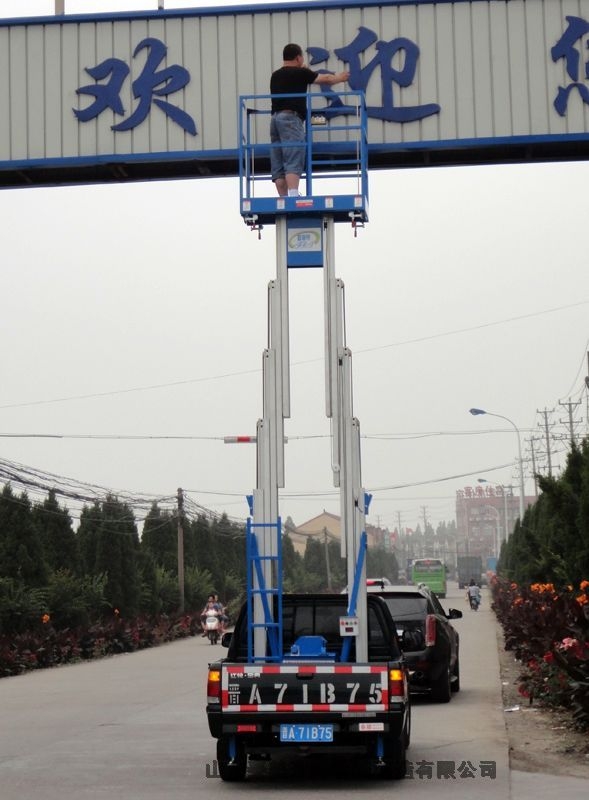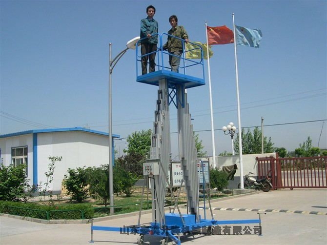 三立柱铝合金升降机:三组桅柱支撑作业平台同步升降,支退结构同单桅柱式平台,具有超大的载重量的工作稳定性。整体升降式护栏装置,强度好,运输时大幅度地降低整机高度,装卸十分方便,通过一次升降即可完成装配或拆卸。该升降机承载能力强,适合于两人(可携带一定的重量工具和材料)同时登高作业;还可根据不同环境订制成各种非标产品,以满足不同需要。