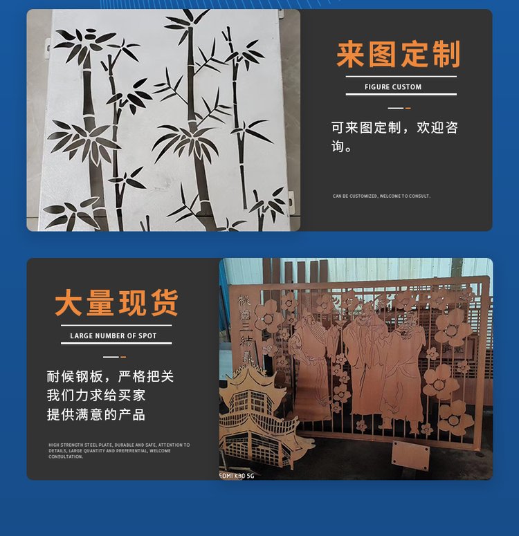 锈钢板标识指示牌耐候钢方管栅栏围栏镂空激光雕刻图案景墙