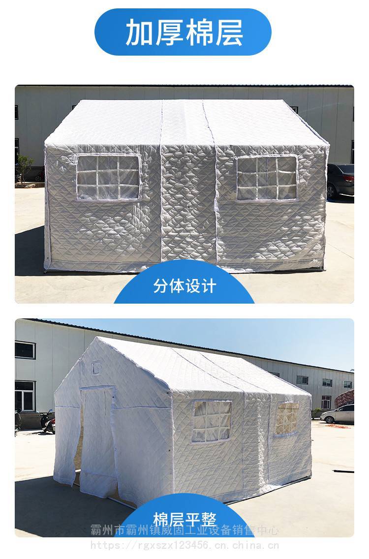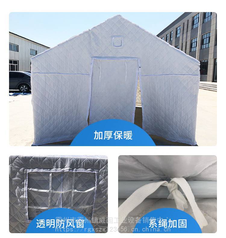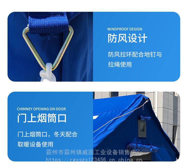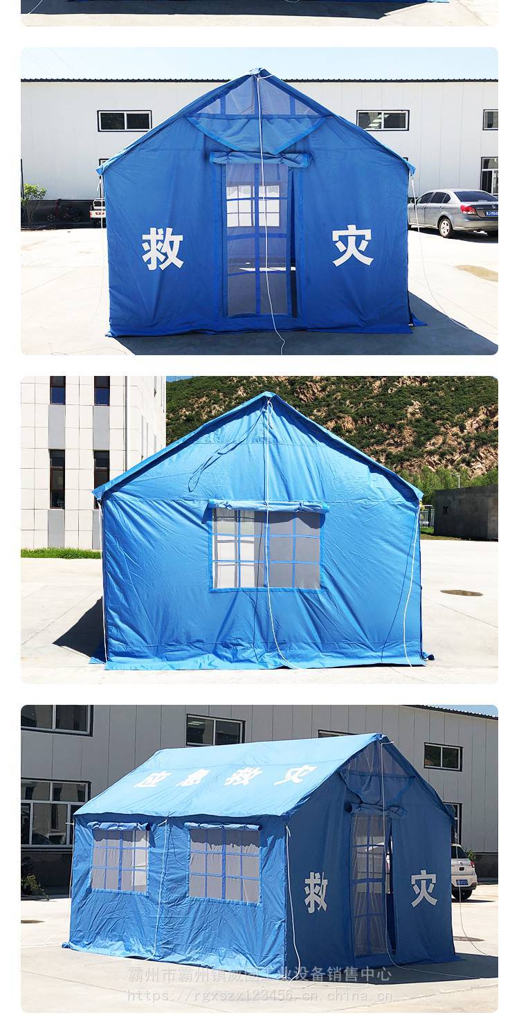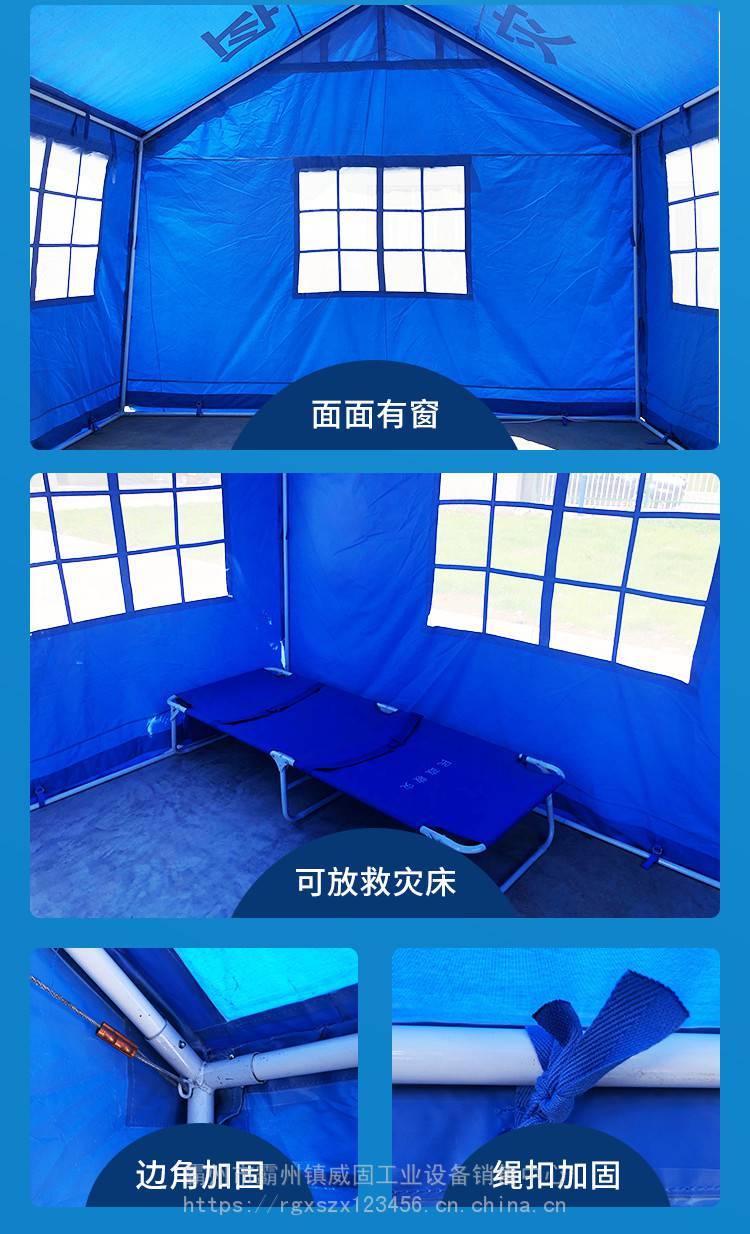帐篷为长方形双坡面直立墙建筑样式,开门山墙上开三角窗一个,开窗山墙开三角窗一个,方形窗一个,两侧墙各开方形窗户两个。侧墙可以支起成阳篷,整体帐篷通过拉绳拉起,用三角桩加固。篷架为插接式框架结构,柱底四周全部设有落地横杆。能在自重和风力荷载作用下安全使用。安装帐篷报器,防止人员缺氧或一氧化碳中毒,确保入驻帐篷人员的人身生命安全。篷体可根据采购单位要求印“应急救援”字样。
