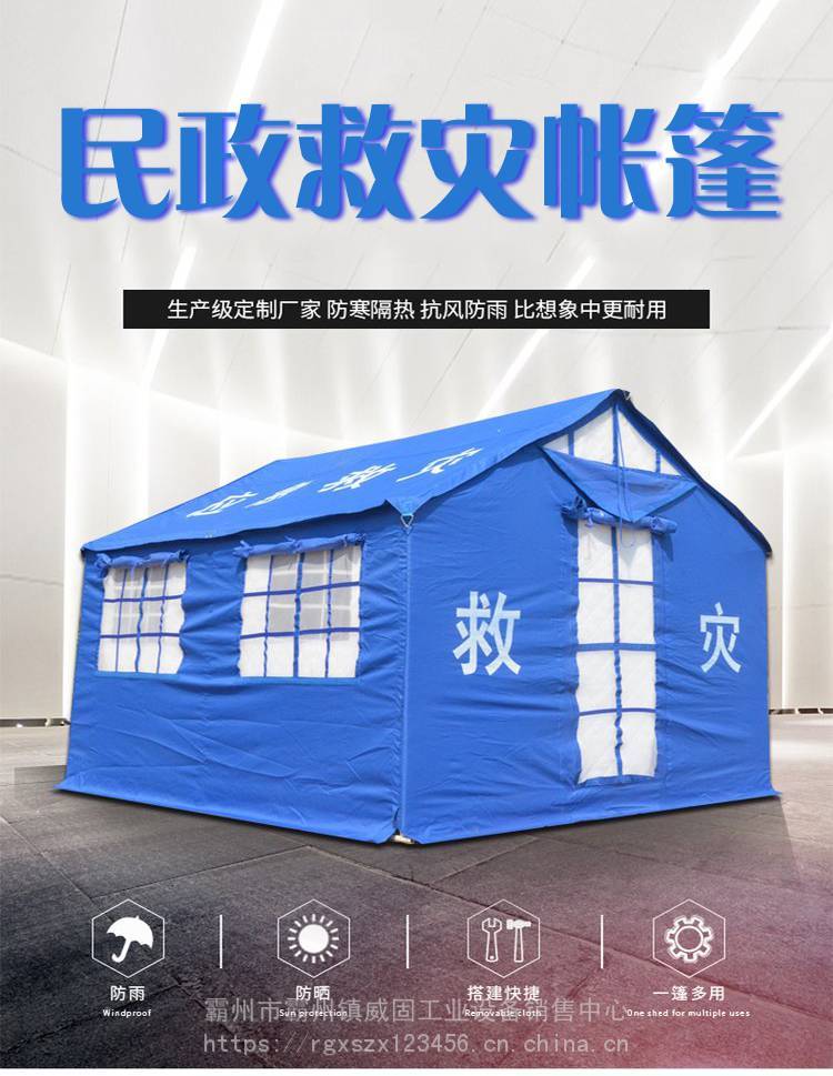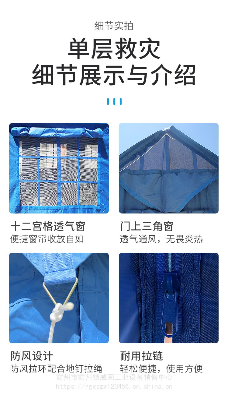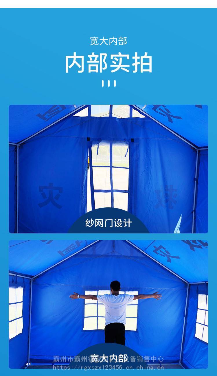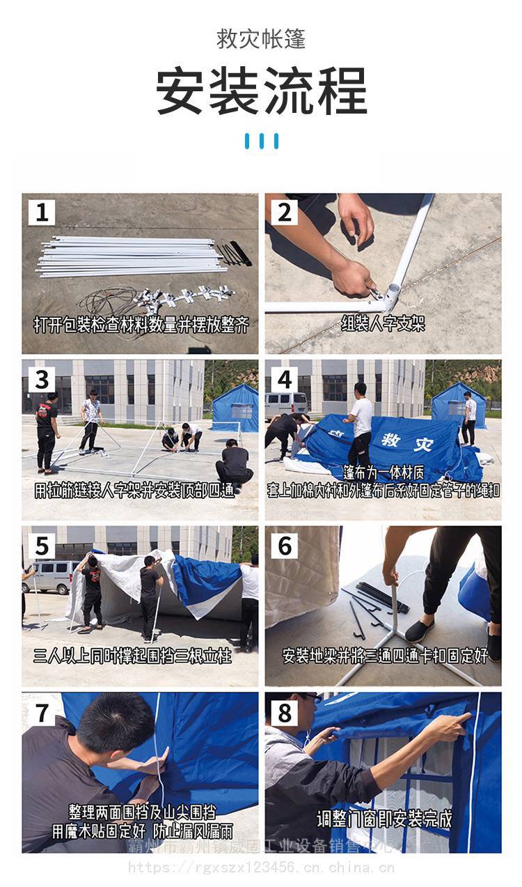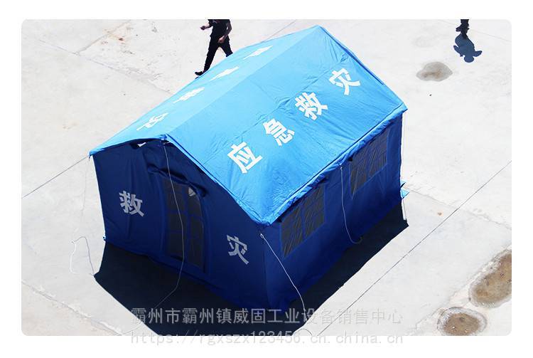 篷体颜色为天蓝色,印有“应急救灾”白色字样;