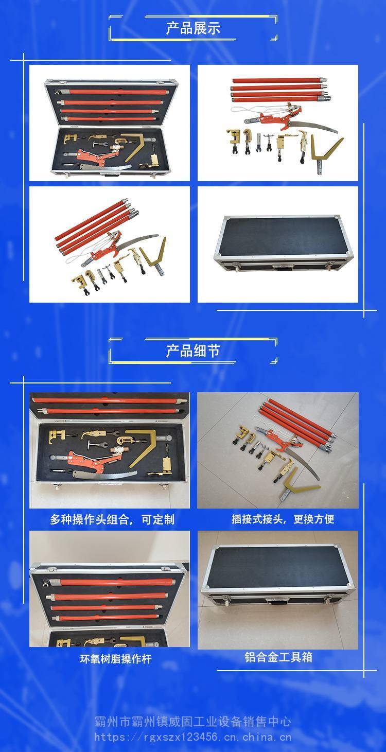组合工具有数根绝缘杆及不同功能的端部配件组成,使用时杆与杆可以自由组合,端部可自由更换不同功能附件,整体组合成一套绝缘杆式组合工具