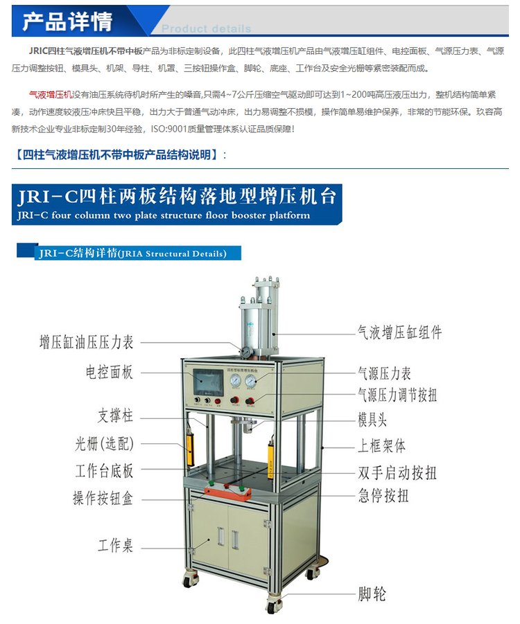 JRIC四柱气液增压机不带中板非标定制质量保障