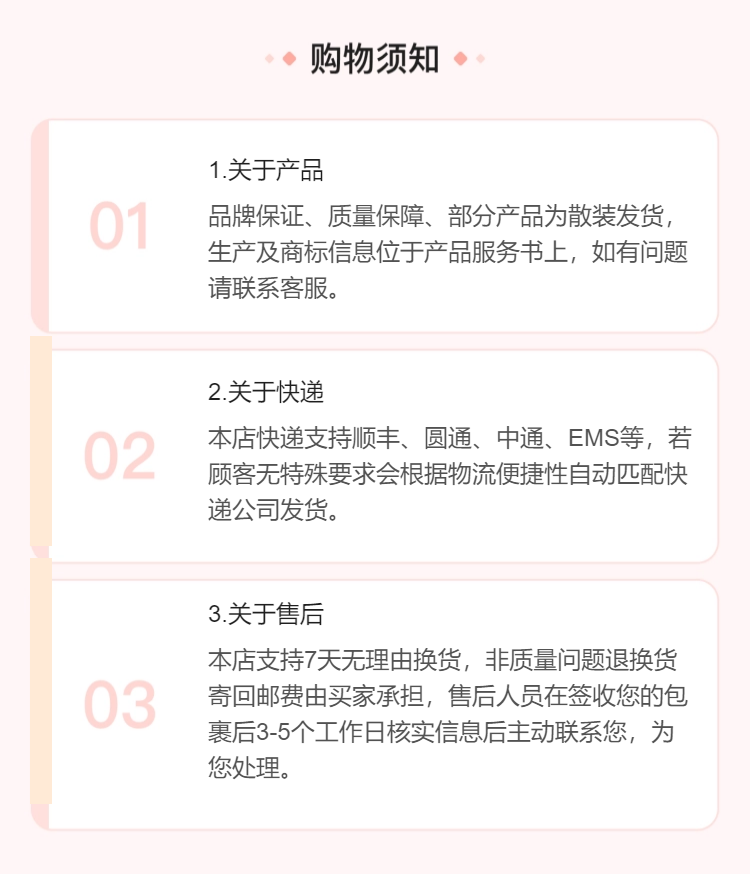 发货方式 | 支持顺丰、圆通、中通、EMS等 | ||