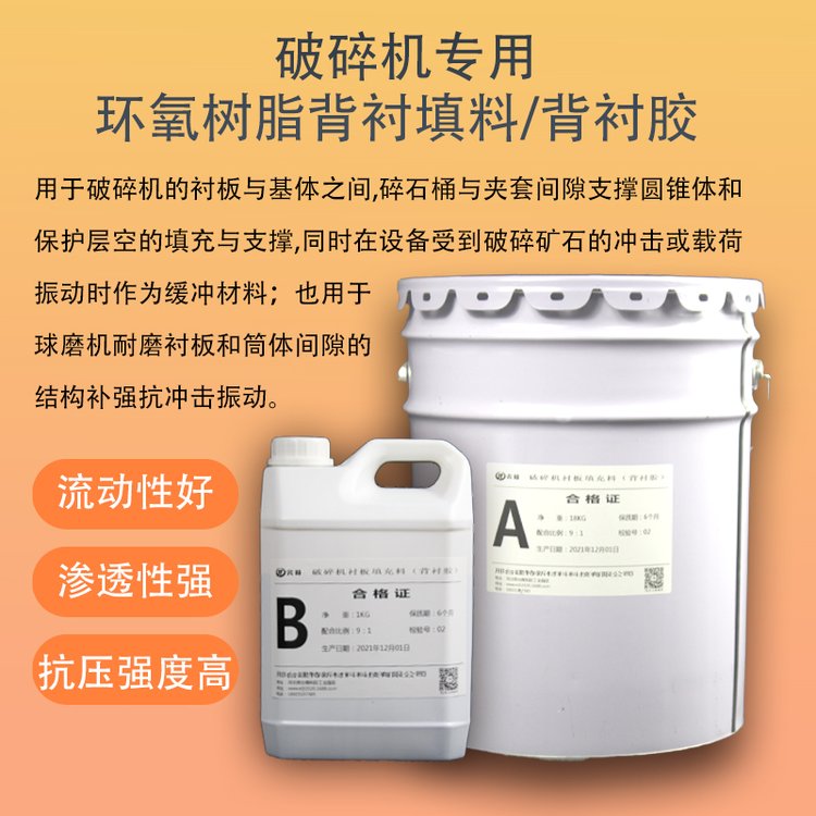 环氧树脂背衬填料用于弹簧、液压圆锥破碎机,旋回破碎机的动锥衬板与躯体:定锥衬板与架体的浇注填充。破碎机工况恶劣,冲击、振动载荷极大。该产品用于破碎机的衬板与基体之间,碎石桶与夹套间隙,支撑圆锥体和保护层空的填充与支撑, 同时在设备受到破碎矿石的冲击或载荷振动时作为缓冲材料;也用于球磨机耐磨衬板和筒体间隙的结构补强,抗冲击振动。