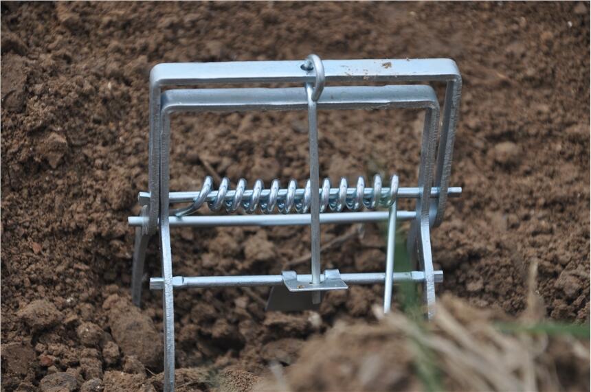 2. 将安装完毕的景隆鼹鼠夹放在挖好的坑里。鼹鼠活动的地方就放置一个夹子,形成一条鼹鼠经过就会有一个夹子的通道;