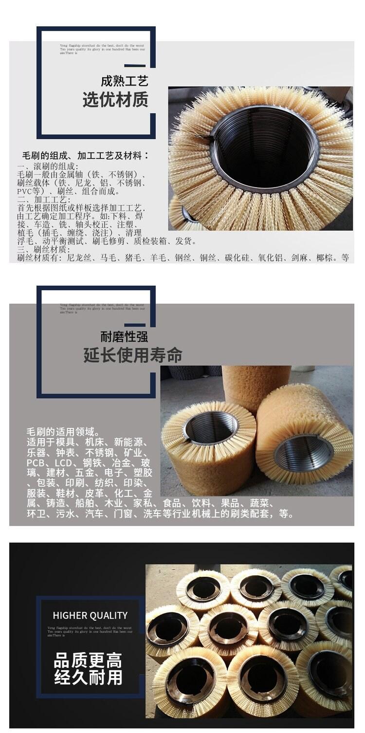 弹簧缠绕毛刷 铁片组合毛刷 植毛毛刷辊 我厂同时生产蔬菜水果清洗去皮机械毛刷简介:刷毛采用尼龙耐温抗菌刷丝,具有耐温、抗菌等特点,种毛的金属丝为不锈钢材料,辊轴也可采用不锈钢件体加工,毛刷制作工艺为电脑钻孔载毛,刷丝不弯曲、不脱落、耐磨耐用,可用于各种蔬菜、土豆、胡萝卜、地瓜、水果保鲜前机械清洗、去皮,除去农药残留等作用。食品设备毛刷更是多样化,有土豆清洗机,土豆抛光机毛刷,胡萝卜清洗机毛刷辊,各类蔬菜根茎清洗机毛刷,干豆腐皮机毛刷等,刷辊为白色尼龙管,刷轴为号碳钢及不锈钢材质可选,刷毛为尼龙刷丝和美国杜邦丝可选,质量保证,价格便宜,欢迎咨询订购。