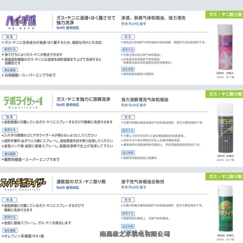 优势供应日本山一化学(YAMAICHI)工業株式会社生产的全系列产品:脱模剂、防锖剂、防锈剂、清洗剂、润滑剂、高温润滑脂,常用产品型号如下:山一化学(YAMAICHI)防锈剂、气化性防锖剂PART II;山一化学(YAMAICHI)脱脂洗净剂E.O. CLEANER;山一化学(YAMAICHI)金型脱脂清洗剂DX. CLEANER;山一化学(YAMAICHI)离型剂SEPALUCK;山一化学(YAMAICHI)润滑剂RUST-CUT SP;山一化学(YAMAICHI)除油脂剂DEPO-RISER A;山一化学(YAMAICHI)除油脂剂SUPER DEPORISER;山一化学(YAMAICHI)高温润滑脂GREASE NS1001山一化学YAMACHI润滑油脂NEO NS1001;山一化学(YAMAICHI)金型防锖剂SUPER GUARDMAN