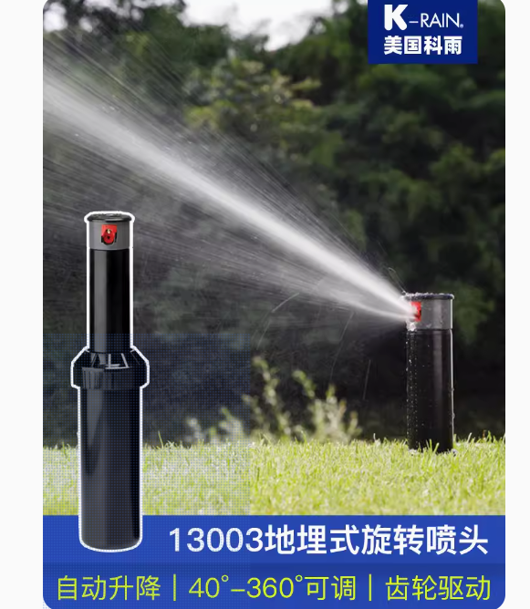 适用于公园,公共绿地或运动场等中、小型商用场所的灌溉,配有5个不同射程流量的喷嘴,可调喷洒半径为5-9米。