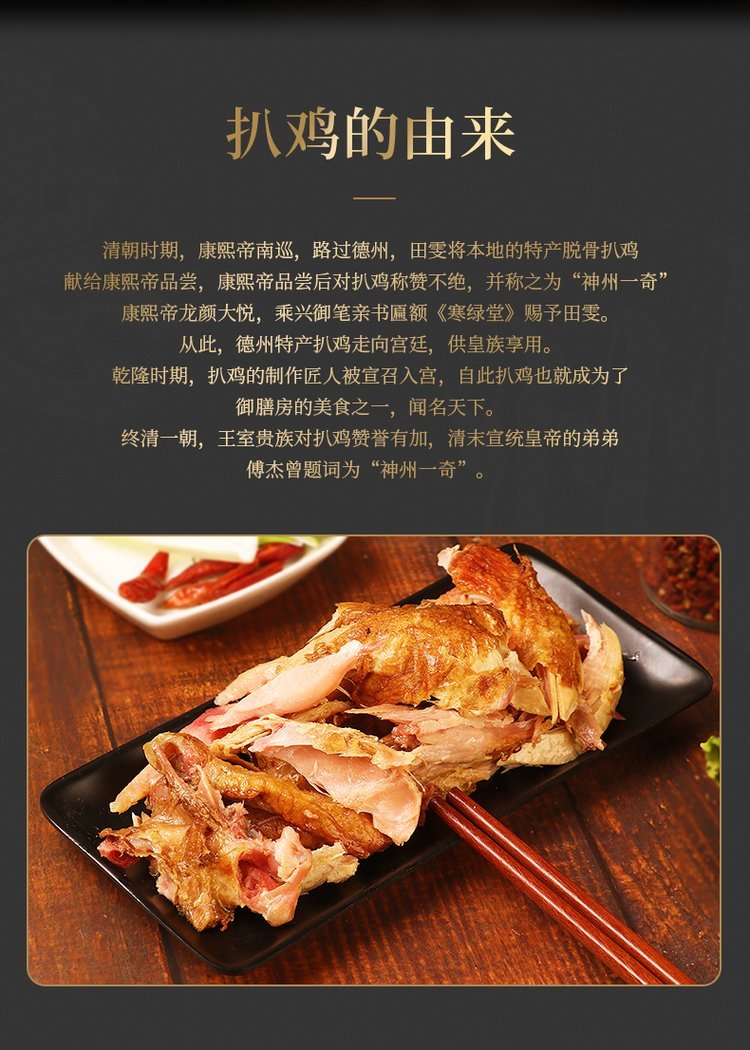 鸡肉蛋白质含量高、富含多种氨基酸,容易消化是温补益气的佳品,我们的厨师也努力发挥他们的聪明才智,一种鸡肉百种吃法,其中典型代表莫过于我们的“四大名鸡”了,包括:道口烧鸡、符离集烧鸡、沟帮子熏鸡和扒鸡,而扒鸡出名的莫过于德州扒鸡了。