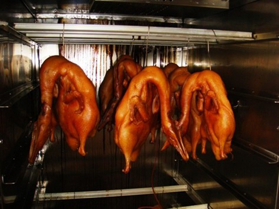 正康系列烟熏炉采用自动可编程控制,操作方便简单。干燥、蒸煮、烟熏三工序可按设定时间自动转换,温度按设定值自动调节,工序结束自动显示;主循环风扇送风均匀,使炉体内温度均匀,该机特别采用了双层不锈钢散热器,对炉温升温迅速,干燥效果极佳,而目前国内同关产品采用盘管式加热器,两者的升温效果是无法比拟的。采用设定参数方式,通用性广,自动运行中的参数可修正。