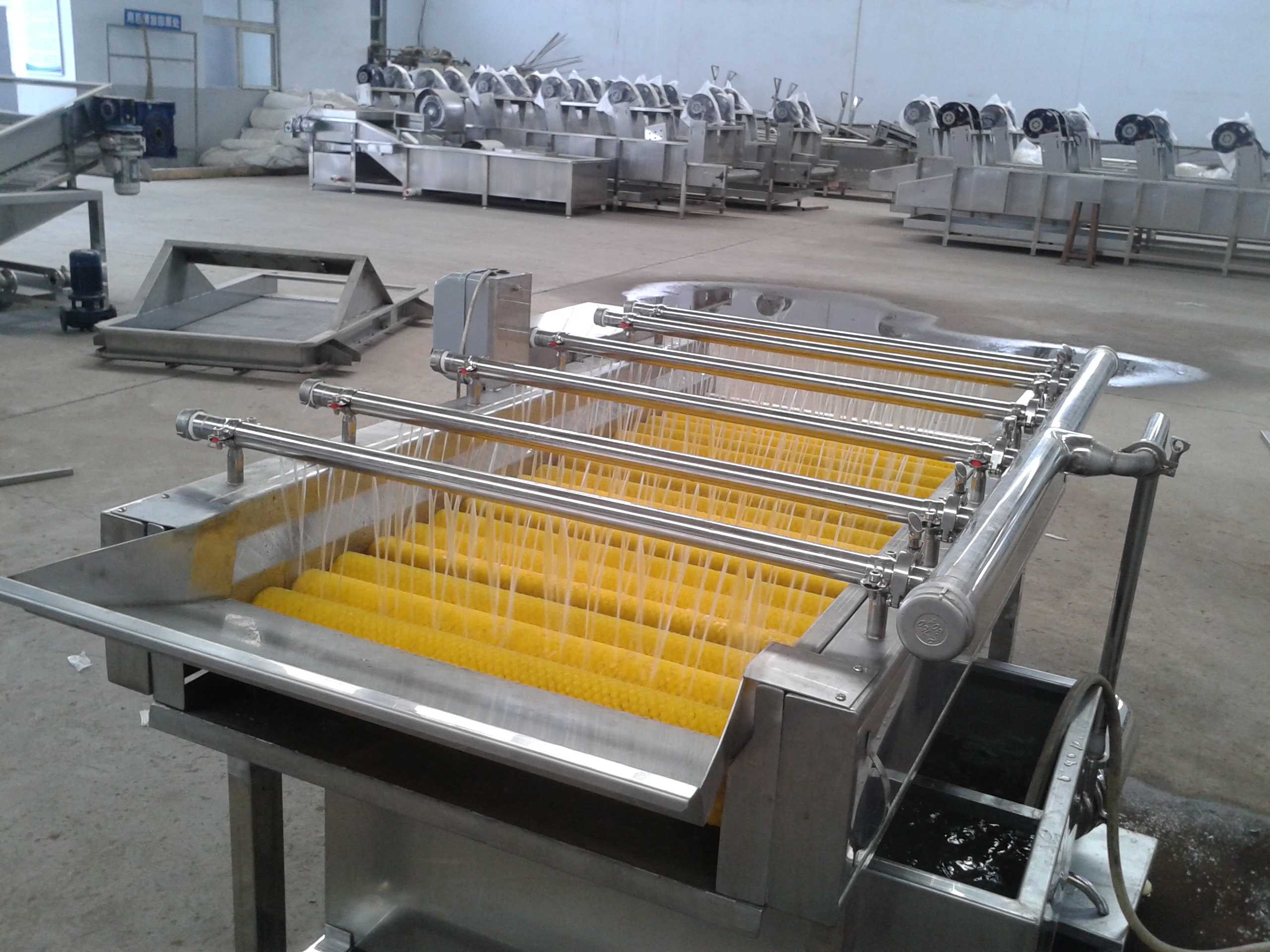 本机主体采用304不锈钢制作,严格按照国家食品出口标准。本机适用于草莓、土豆、胡萝卜、大枣、芋籽等不许损伤表皮的球状(圆柱状)果蔬,设备上面采用高压水流喷淋,下部采用毛刷转动传送,同时可将混入清洗物料中的毛发、纱线、编织丝等杂物缠绕在毛刷上,在上面高压水流和下面滚动毛刷的同时作用下,可将清洗物清洗彻底,表面无泥沙等污物残留,达到产品合格标准。