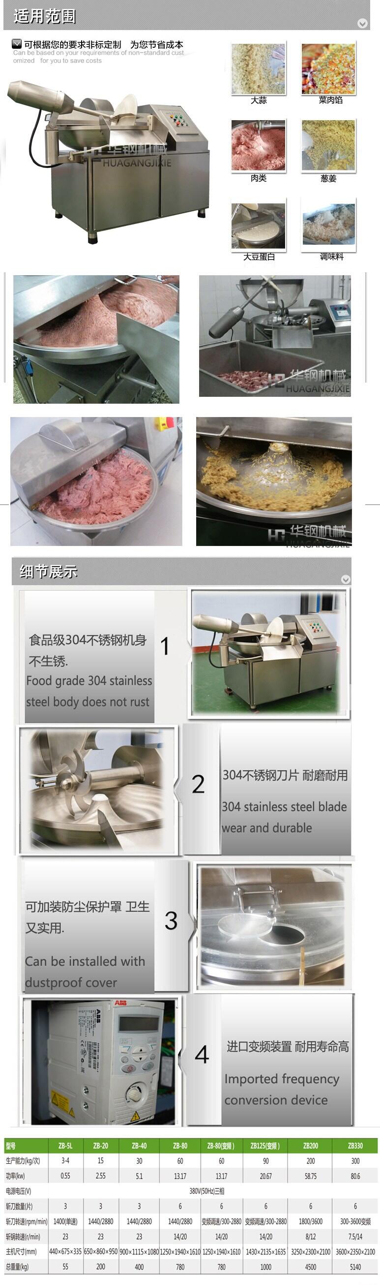 40变频高速斩拌机六把刀可定做 首先,我们先来看斩拌机的材质:斩拌机选用不锈钢作质料,其构造布局大方漂亮、在操作方面简单清洁,达国家仪器卫生标准技术领先、符合加工厂的操作,斩拌机的高速工作其特色能保证肉制品的斩切细度,发热小,斩切时间短,进步商品的弹性和出品率。斩刀选用进口经特别技术加工而成,斩锅为铸造全不锈钢原料。
