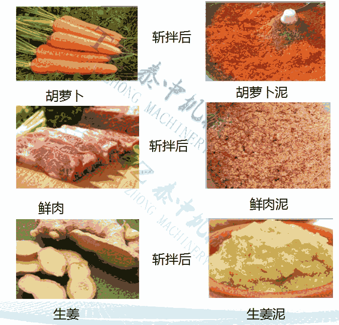 斩拌机利用斩刀高速旋转的斩切作用,将肉及辅料斩成肉馅或肉泥,还可以将辅料、冰片、水与肉馅或肉块一起搅拌均匀。