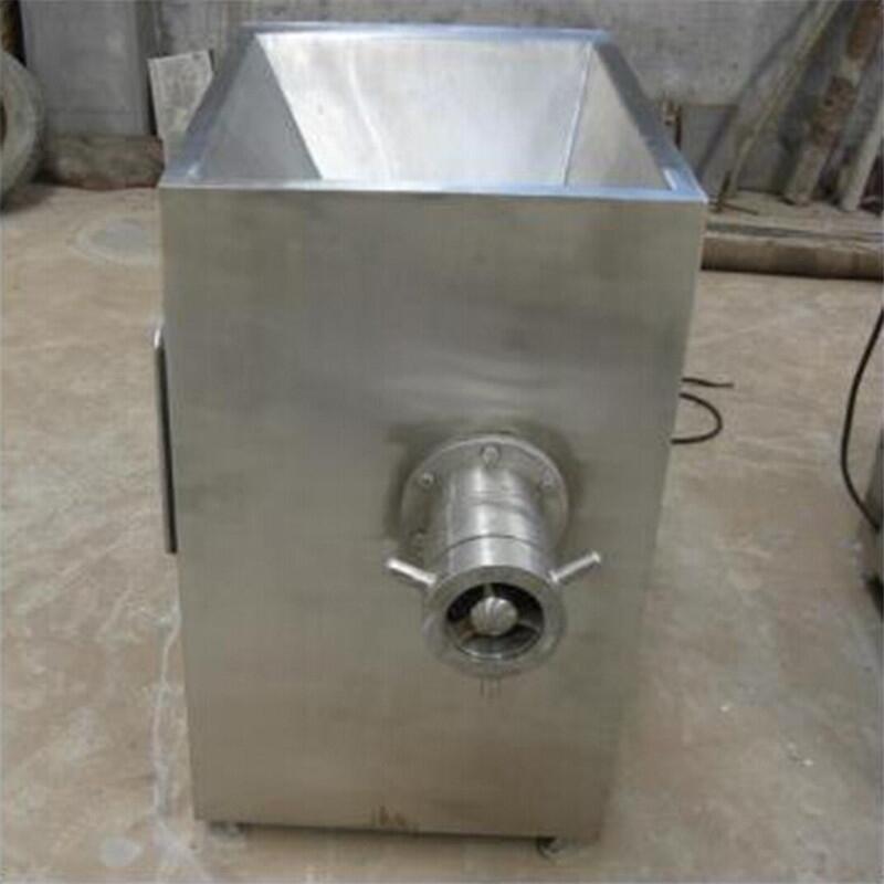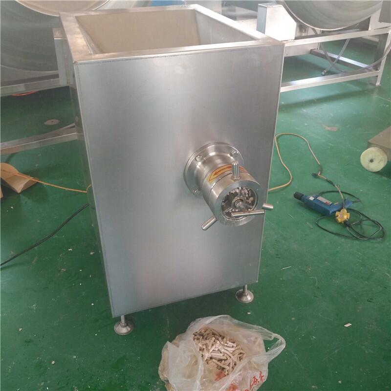 冻肉绞肉机是肉制品生产行业中通用性高使用范围广的一种肉食加工设备。冻肉绞肉机是依靠螺旋杆将料斗箱中的原料肉推到预切板处,通过螺杆的旋转挤压使用孔板与铰刀产生相对运转,从而将原料肉切成颗粒块状,确保了肉馅的均匀性。通过孔板的不同组合可达到理想要求的不同肉馅。