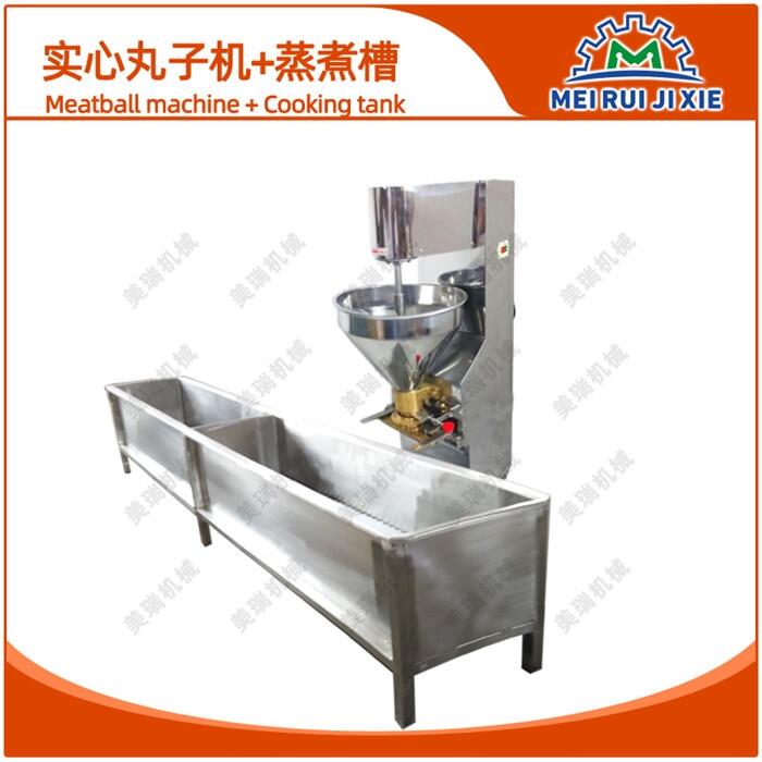 各种丸子加工设备 实心肉丸机 包心鱼丸机还有就是肉丸出来的话是先需要进行定型,定型的温度不能太高了,通常需要设置在80度左右的温度然后进行表面成型的,然后在通过90多度甚至是100多度的一个温度来实现煮熟的状态,煮熟后肉丸的温度还是非常的高的,然后还是需要进行冷却,冷却后就可以冷冻来运送出货了,成品的丸子即便是包装后也是需要进行冷冻处理的。