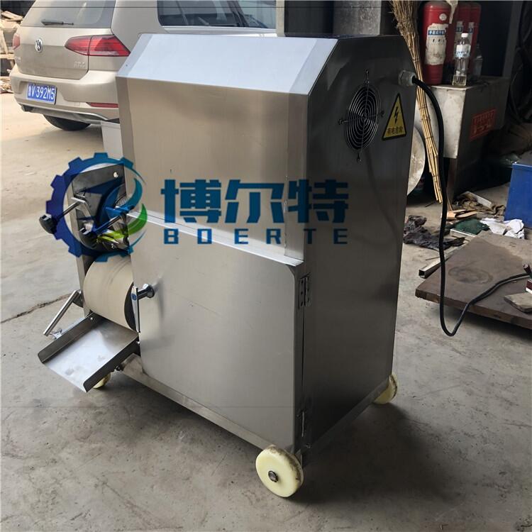 鱼糜采取机 虾壳分离机 全自动去鱼骨机大鱼和小鱼的采集过程略有不同,大鱼的加工时,人工把待加工的鱼先去掉鱼头和取出鱼肚中的内脏;需将鱼剖分成两半,漂洗 干净(避免采出来的鱼浆被内脏及鱼血污染),想要提高产能,也常搭配全自动杀鱼机进行使用。随后将鱼片投入到料斗内(鱼的剖分面朝向采取筒,背 部贴近橡胶带),鱼在橡胶带的带动下进入采取筒与橡胶带的挤压区,在橡胶带与采取筒之间的挤压力的 作用下,鱼肉被挤压通过采取筒上的小孔进入采取筒内,采取筒内的鱼肉碎粒会随着旋转自动送出。而 鱼皮及鱼刺等杂物则被装在机器上的刮刀从采取筒外延上刮下落在收集槽中。