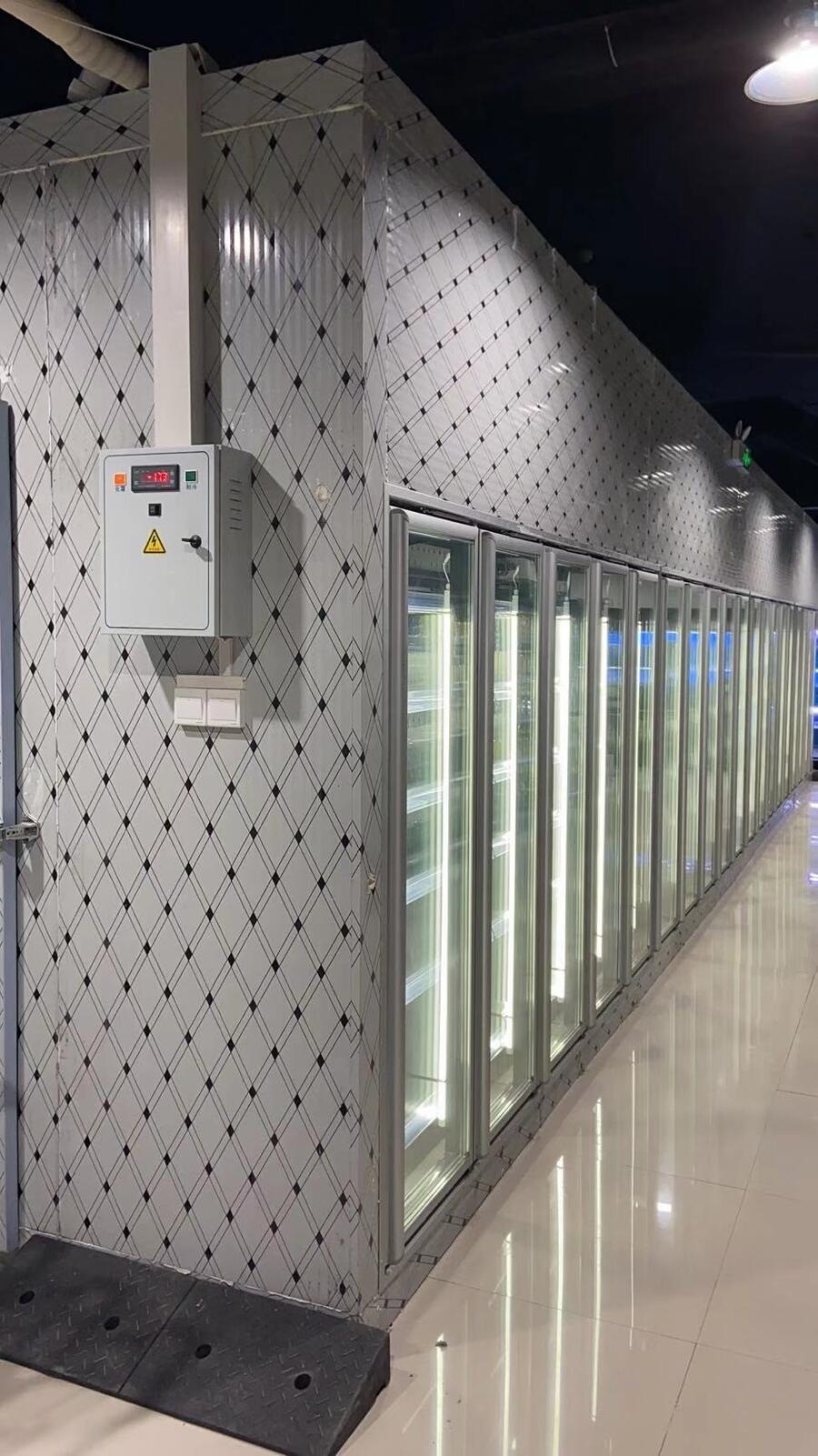 制冷剂:R22/R134 本实用新型提供一种适用于商场的储放商品供顾客选购的后补式冷库。传统的冷库只有销售货架和库门,顾客取货和理货员补货理货共用一扇库门,易造成对顾客取货的影响。本实用新型的后补式冷库,具有一个冷藏室,所述冷藏室前端具有库门,在所述冷藏室的前部设置有销售货架,在冷藏室的后部设置有补货货架,在所述销售货架和补货货架之间设置有理货通道,在所述冷藏室侧面开设有补货门,所述补货门与所述理货通道相通。本实用新型的后补式冷库新增加了一块补货货架和新开设了一扇补货门,商场理货员在理货时,可以不影响和干扰顾客的选购,同时补充的货物由于事先是放置于处于同一温度下的补货货架上,因此,可以保证商品温度的一致性。