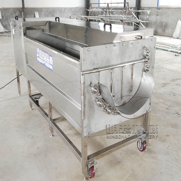 毛辊清洗机主要由电机、变速器、毛棍组等构成,采用毛刷摩擦原理,适用于圆形,椭圆形果蔬比如生姜、胡萝卜、山芋、土豆、红薯、等根薯类蔬菜的清洗、脱皮。毛刷辊清洗脱皮机具有外形美观和操作方便,设备小巧,占地面积也小,清洗脱皮容积大、,耗能小,可连续清洗,操作简单,使用寿命长等特点,毛刷棍为经特殊工艺处理的尼龙线绳轧制材料,软毛刷比较适合清洗作业,脱皮为加硬毛刷材料,两者皆性能相当好。全机采用不锈钢材质,旋转出料,不锈蚀、清洁卫生。也可在机器底部加装废料收集盘,防止污水皮屑等污染地面。