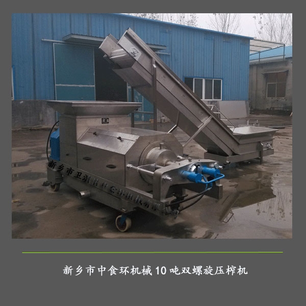 该机为双螺旋,压榨螺旋与输送螺旋安装旋向相反,适用压榨榨菜、酒糟、咸菜、甜高粱、沙棘果、菠菜等含一定纤维的水果和蔬菜提汁。压榨机工作中对酒糟的压榨力大而均匀,出渣口锥形体由液压装置或弹簧、气压控制,调节以上压力可改变对榨菜、酒糟的施压效果,调整出汁率,其效果因榨菜、酒糟不同会有一定差别。与酒糟接触部分采用不锈钢制造。该机由机架、传动系统、进料部分、榨汁部分、弹簧(液压系统))和护罩以及电器系统组成。压榨螺旋与主轴一起旋转,酒糟输送螺套在主轴上与压榨螺旋做反向旋转。通过压力弹簧控制酒糟出口的大小,排渣的干湿可根据要求随时控制,1.5吨为链条传动,其余型号为齿轮传动。