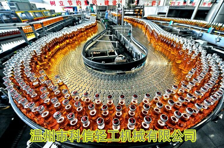 科信格瓦斯生产线是引进德国主要设备技术生产的啤酒瓶装生产线,属于灌装生产线系列,其技术性能和设备的可靠性、稳定性均达到国际上先进水平。每班年产量可达到6万吨。灌装机具有二次抽真空功能及高压激泡装置,采用开式齿轮及同步跟踪传动,效率高、噪声低、寿命长。采用全不锈钢磁性料斗,皇冠盖的理盖、下盖、进盖均为磁力传送,确保盖不变形,量大通畅,对中导向采用导杆式对中有预罩功能。洗瓶机具有浸泡槽多、除标多、浸泡时间长的特点,进出瓶采用曲柄摇杆机构与凸轮跟踪机构,可采用单端或双端进出瓶型式传动机构可采用变频调速传动或同步跟踪确保稳定,噪音低、负荷小。杀菌机采用PU值微机自动控制原理,全不锈钢结构,双层双通道连续链网输送,运行平稳,透水性好,强度高,对清洗、维修及生产中随时观察都十分方便。装卸箱机运行平稳、动作可靠、生产效率高、操作容易、全部运行过程采用计算机程序控制。输瓶系统是通过生产线上运行状况联锁控制瓶带上瓶子的运行速度,使之不易产生相互挤压造成卡瓶,倒瓶或栏杆变形现象。另外,灌装及贴标机进口处输瓶均采用无压力输瓶系统
