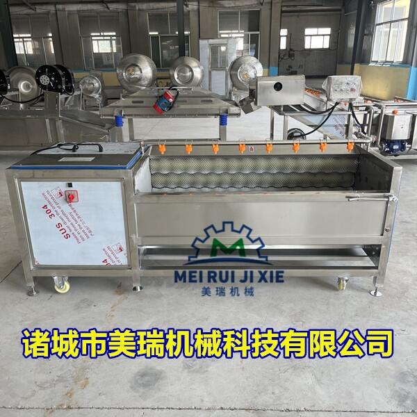猪头猪蹄清洗机 胡萝卜清洗设备 1000型毛辊清洗机此款清洗能力大、洗净率高,流水线中各个单机可根据用户各自不同的加工特点量身定制,段加入清洗剂喷淋的去油污段,第二段为清洗净洗段。程度满足工艺要求;主要分为两段,清洗机采用高压喷淋清洗,采用优质SUS304不锈钢制作,经过旋翻至振动拨料上机后输送到软包装风干机上进行吹干,即可贴标装箱符合国家食品出口标准。