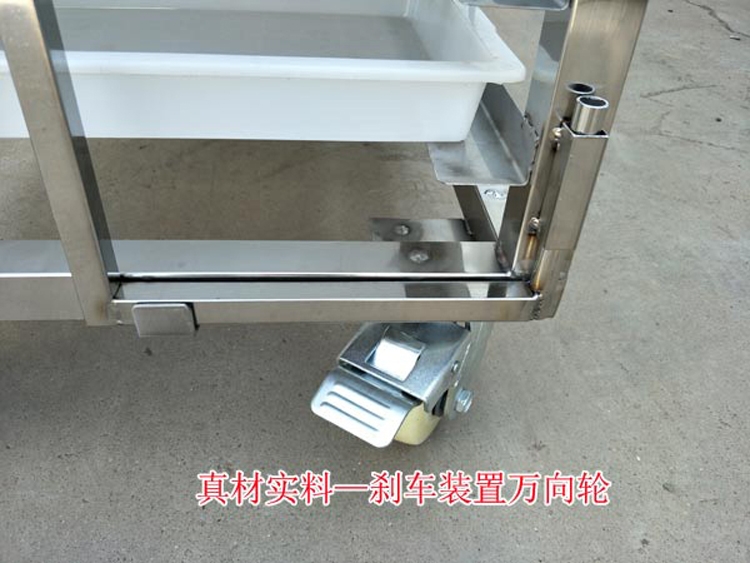 2、新型鱼豆腐蒸车真材实料,架子车底部轮子全部采用高硬度万向轮,耐磨、耐高温、抗冲击。万向轮带刹车功能,千叶豆腐架子车推到蒸箱内部时可以刹车,防止架子车在蒸箱内滑动。