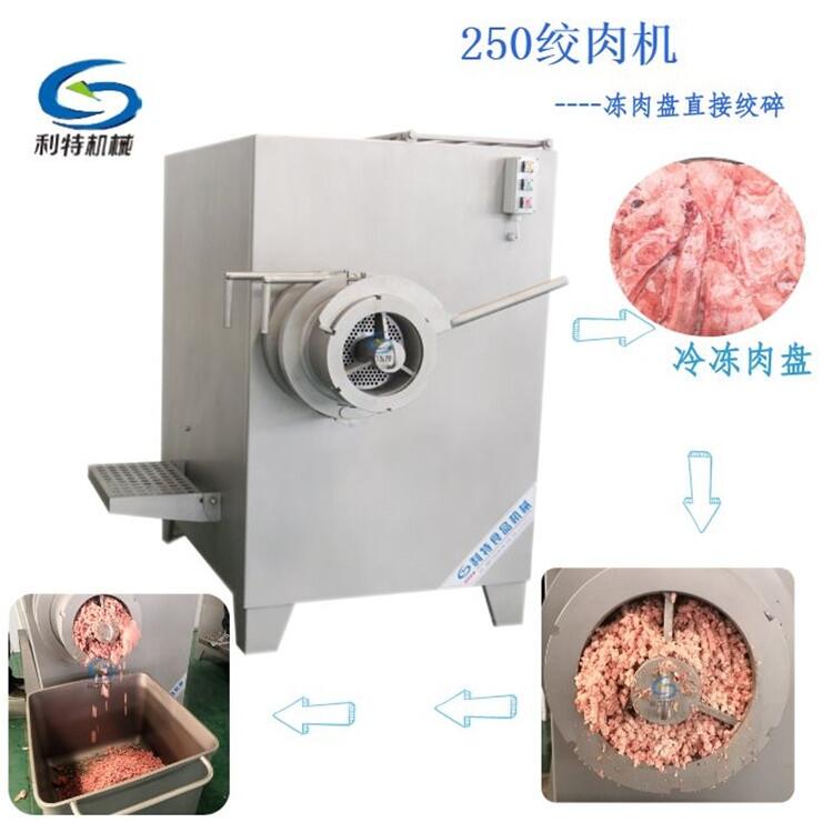 商用电动绞肉机 冻肉绞碎机厂家 肉类破碎机制造商 诸城市利特食品机械有限公司生产的电动绞肉机采用优质不锈钢制造,对加工物料无污染,符合食品卫生标准。 刀具经特殊热处理,耐磨性能优越,使用寿命长。刀组有预切刀、十字刀、孔板刀三把同时进行绞碎,减少了原料的温升,同时提高了了产量。